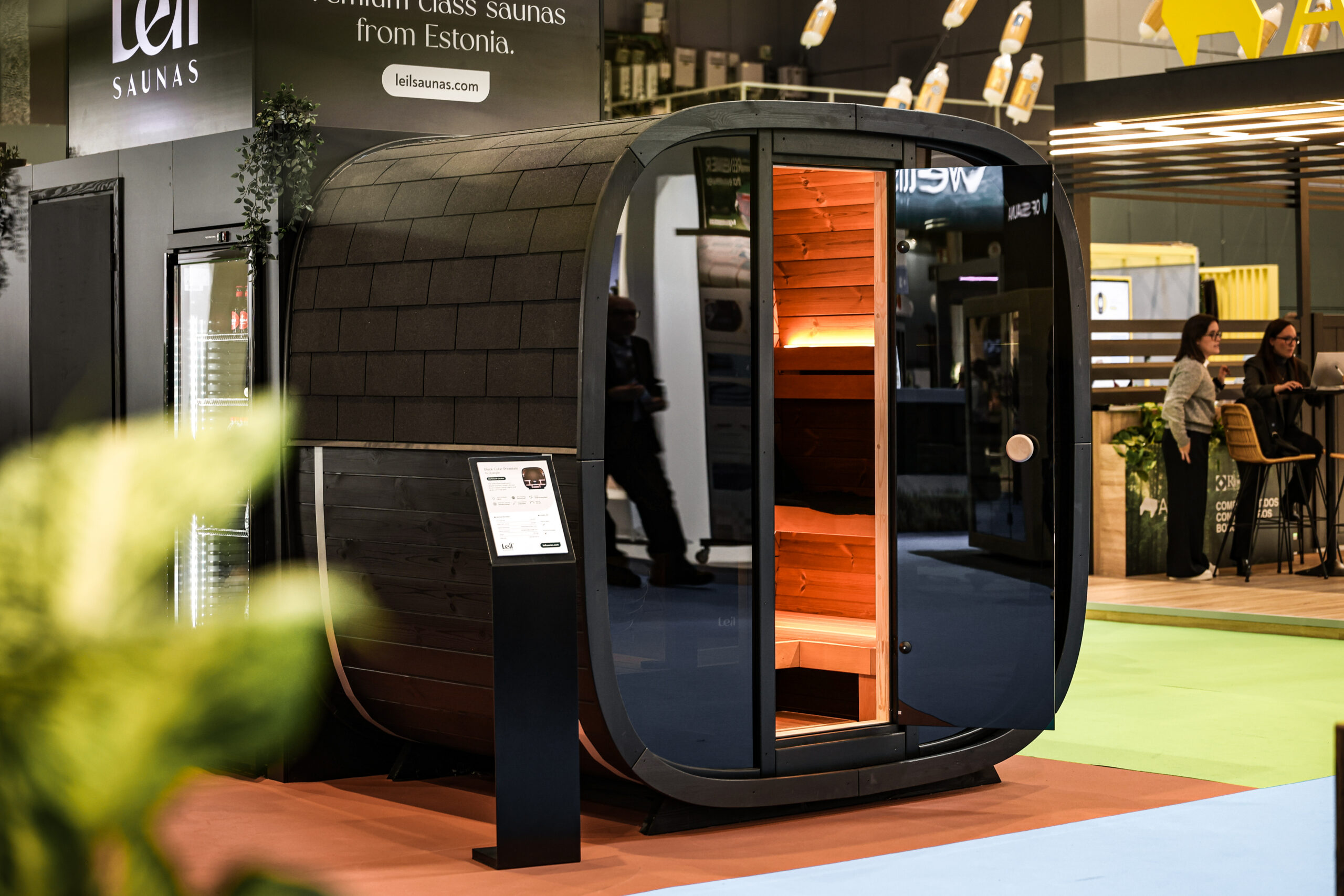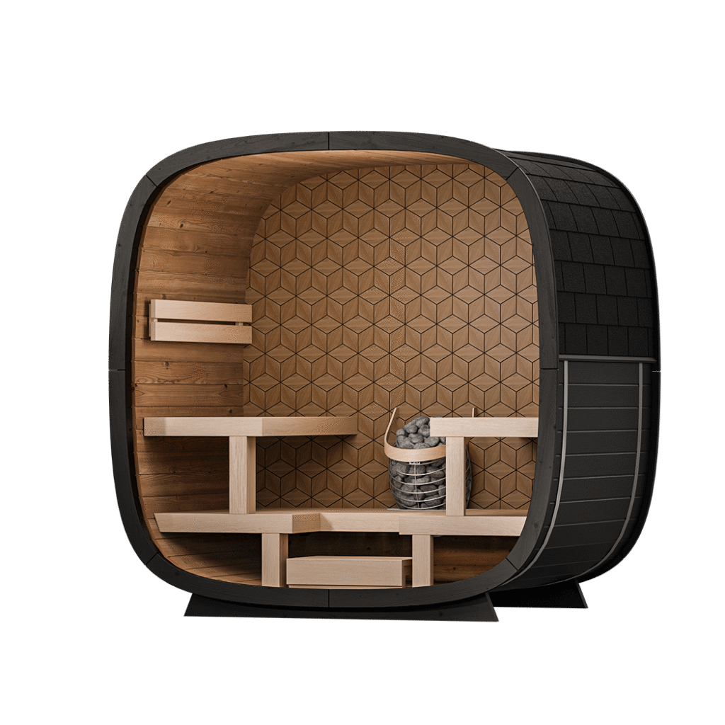 Black Cube four-seated sauna with signature minimalism, now elevated by decorative wall finish and premium materials throughout.