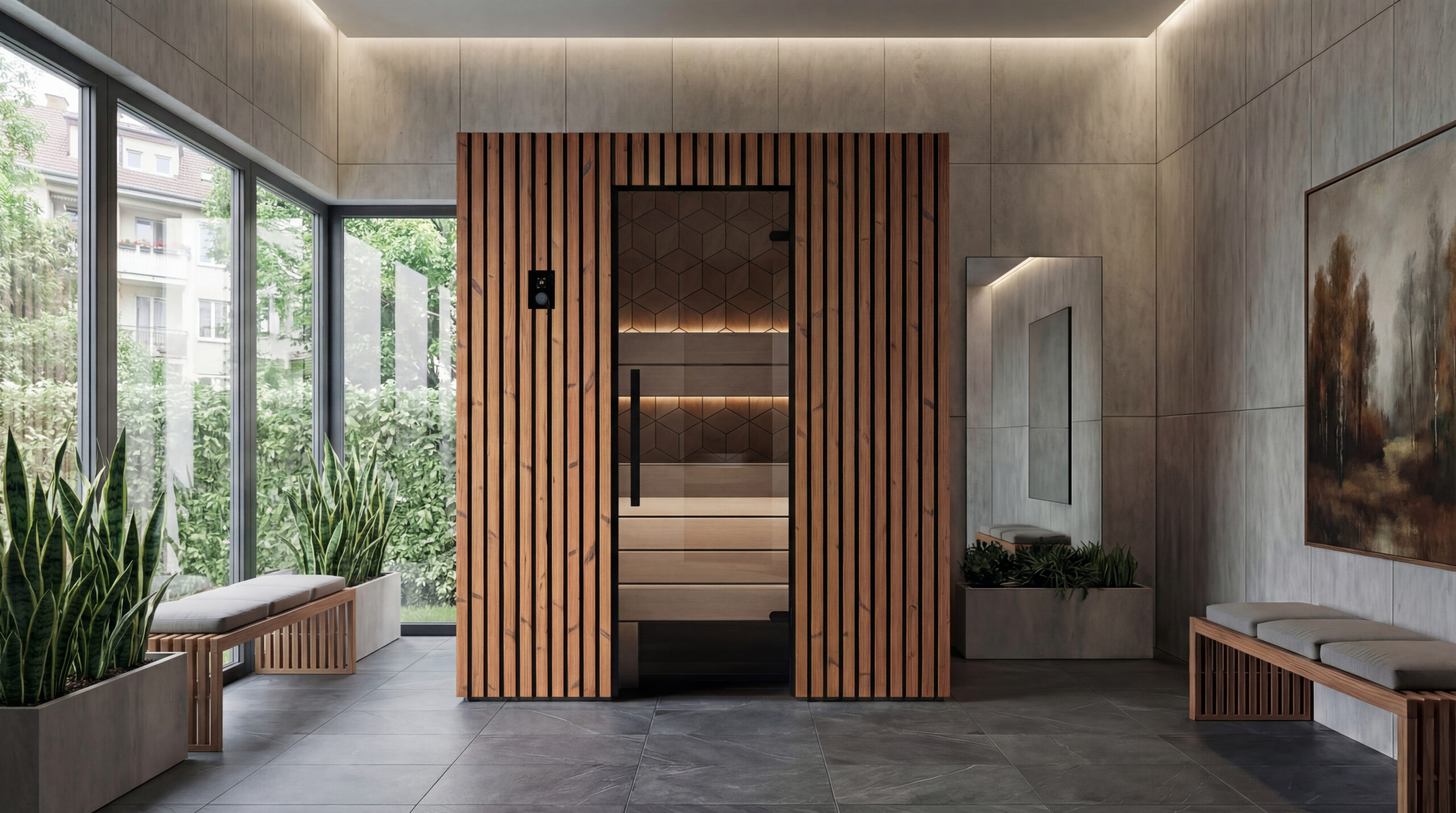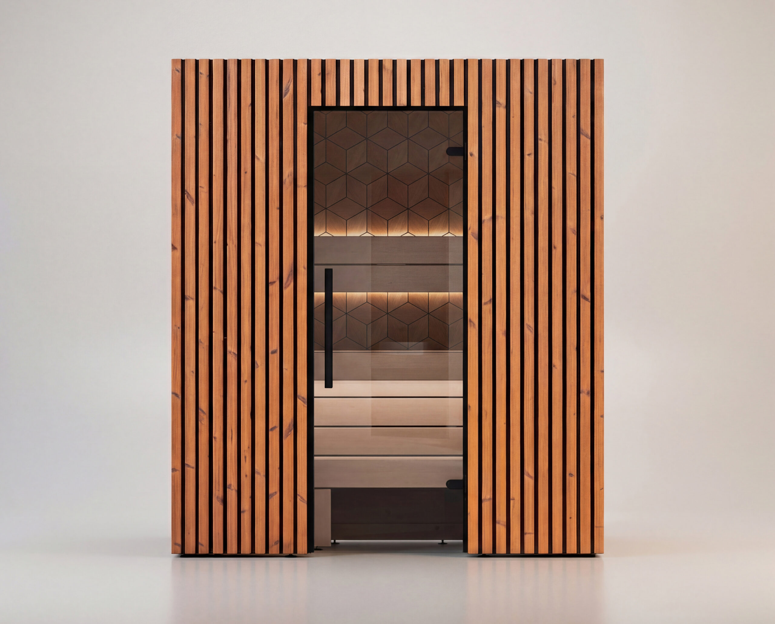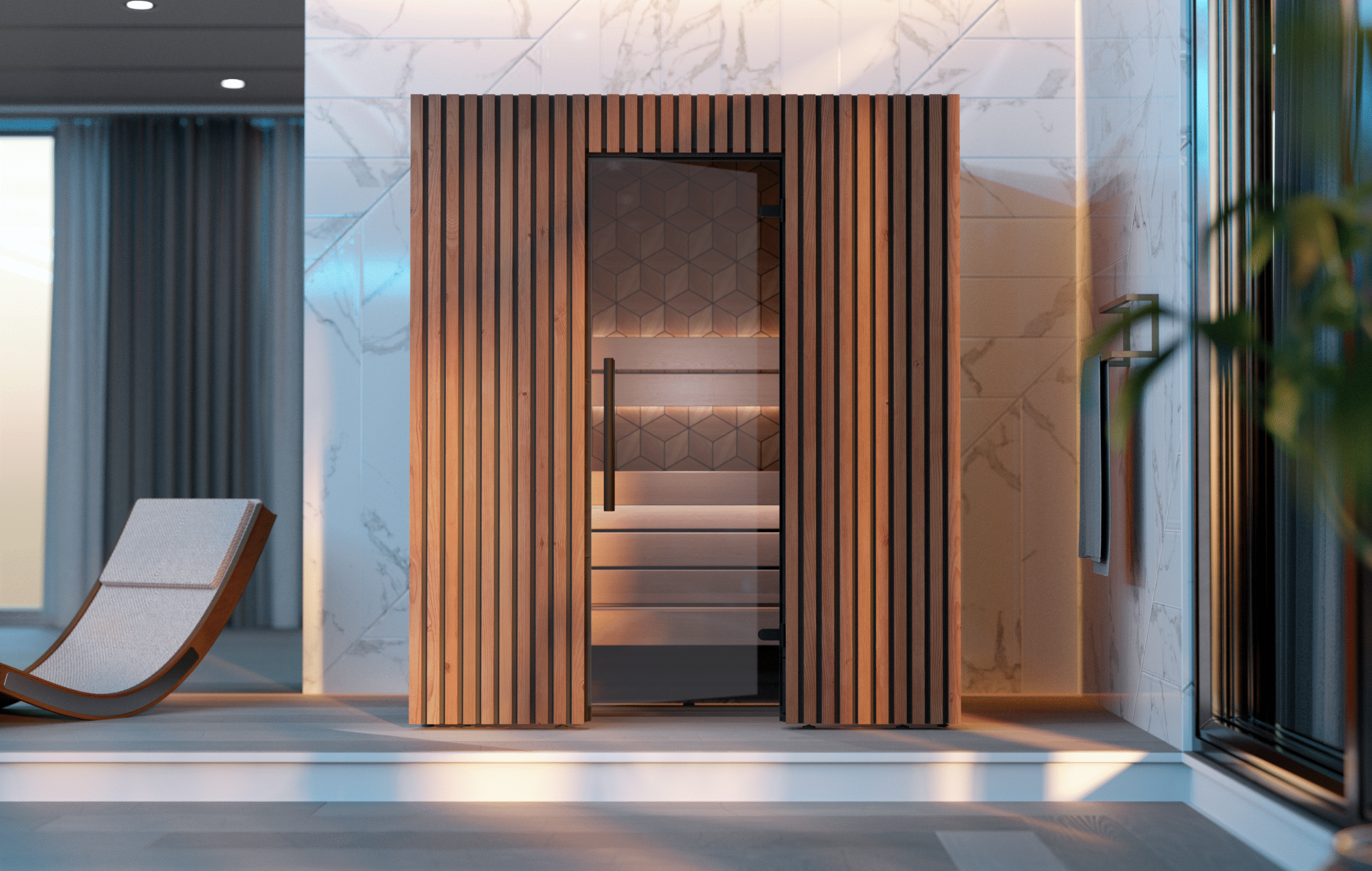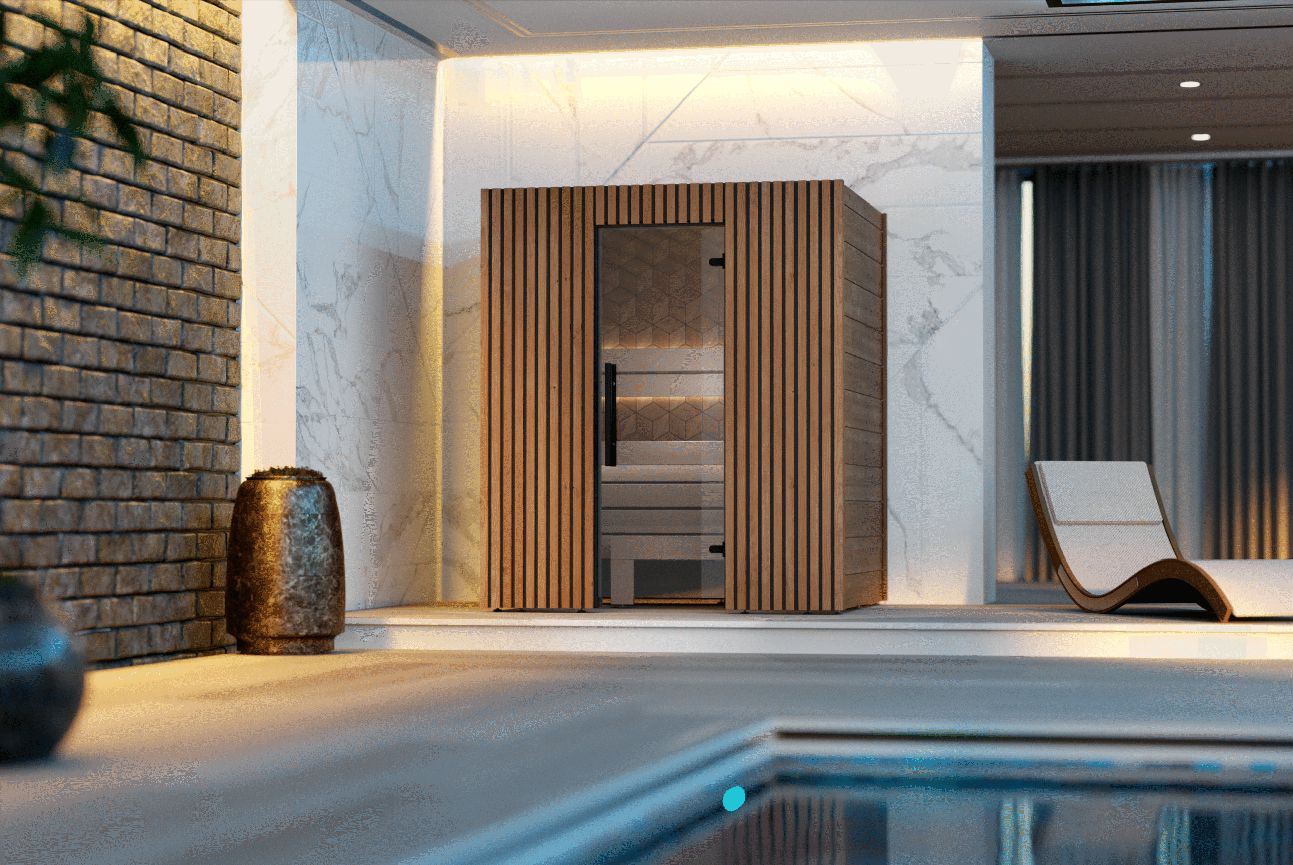Social and spacious sauna for three. Extended seating depth supports longer, more comfortable sessions.