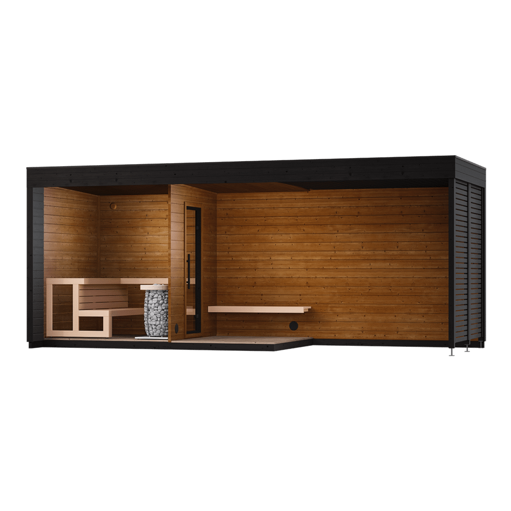 For the ultimate sauna experience, this model has a large front room for relaxing, a spacious sauna room and an additional open area under the roof, combining practicality and comfort.