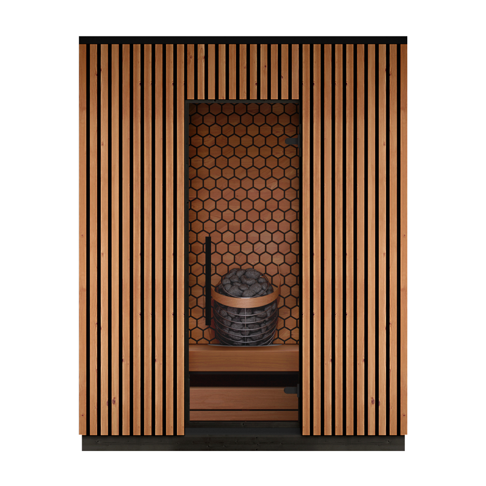 Sauna for four people. The face-to-face bench layout invites conversation and balanced leil. The heater is set into