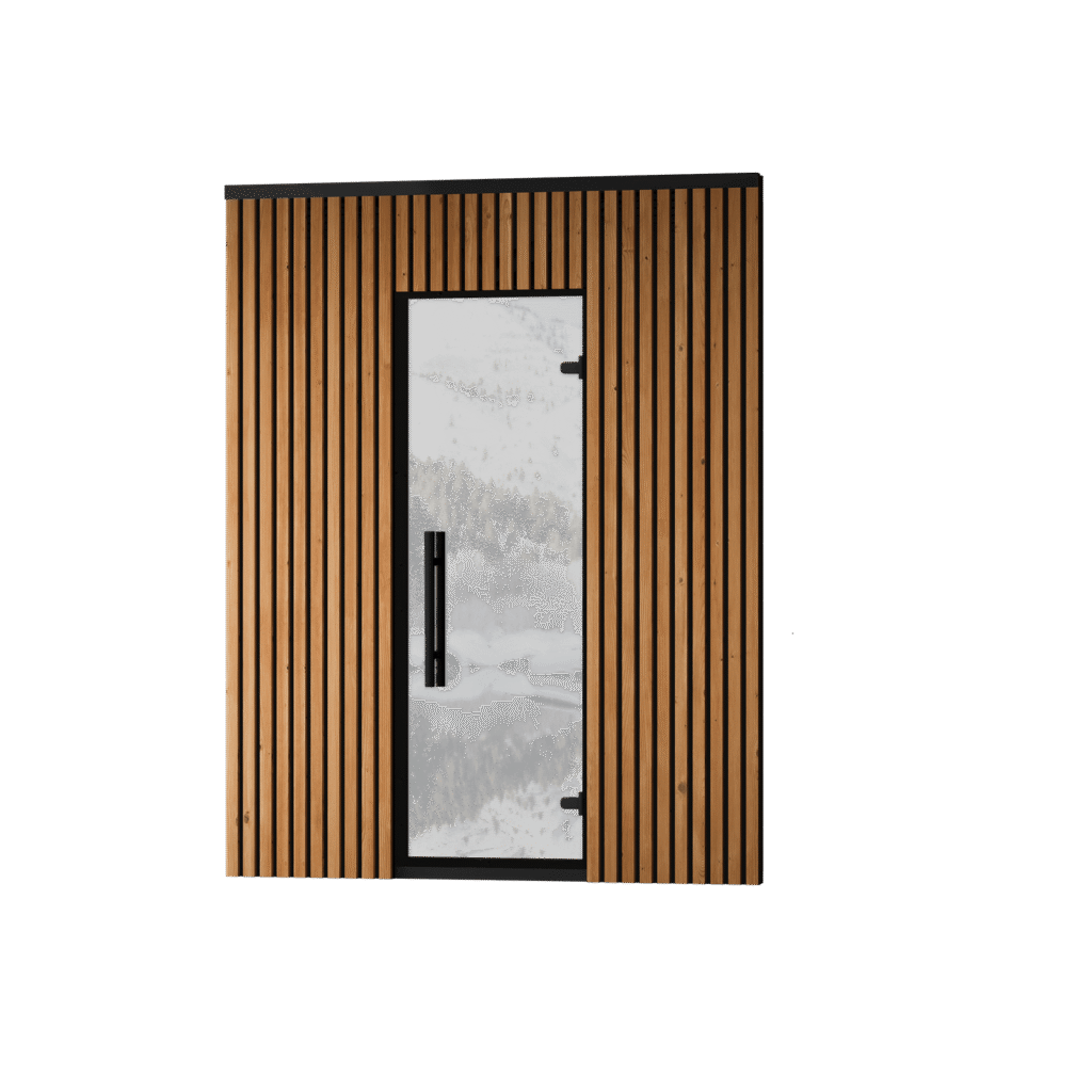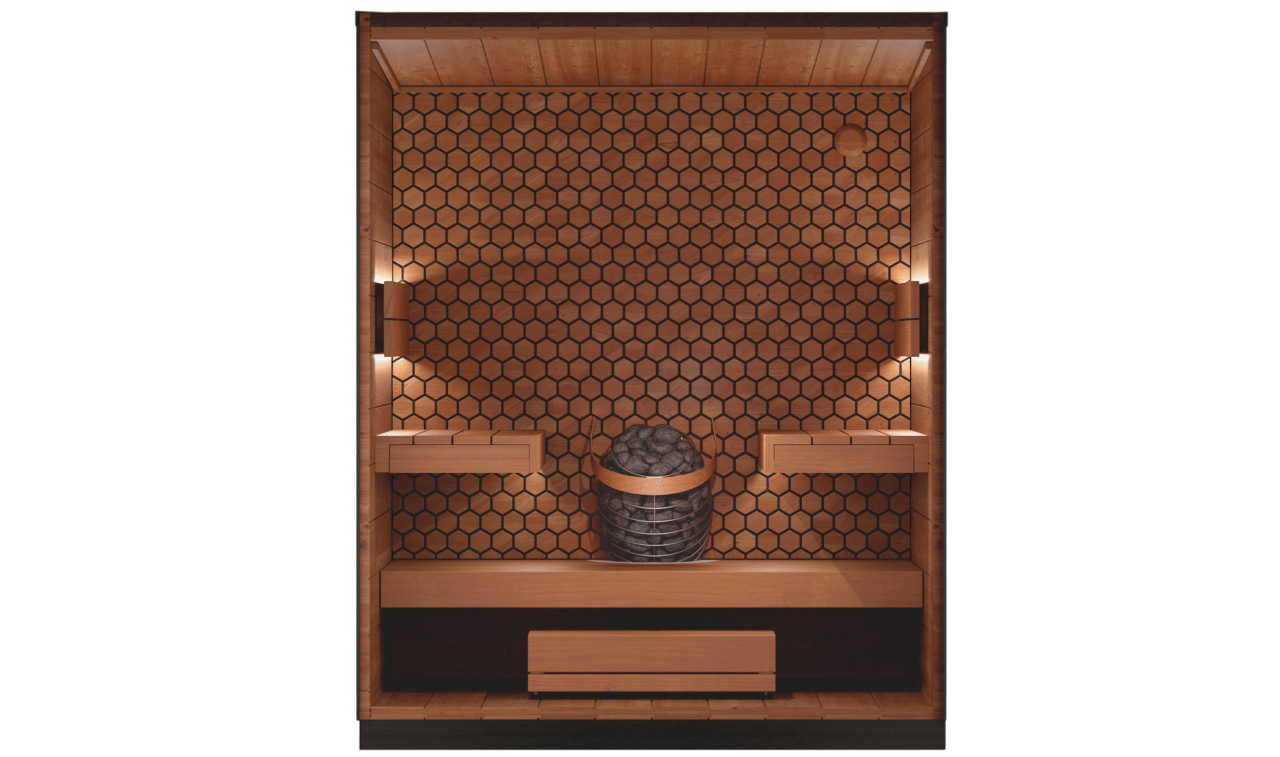 Sauna for four people. The face-to-face bench layout invites conversation and balanced leil. The heater is set into