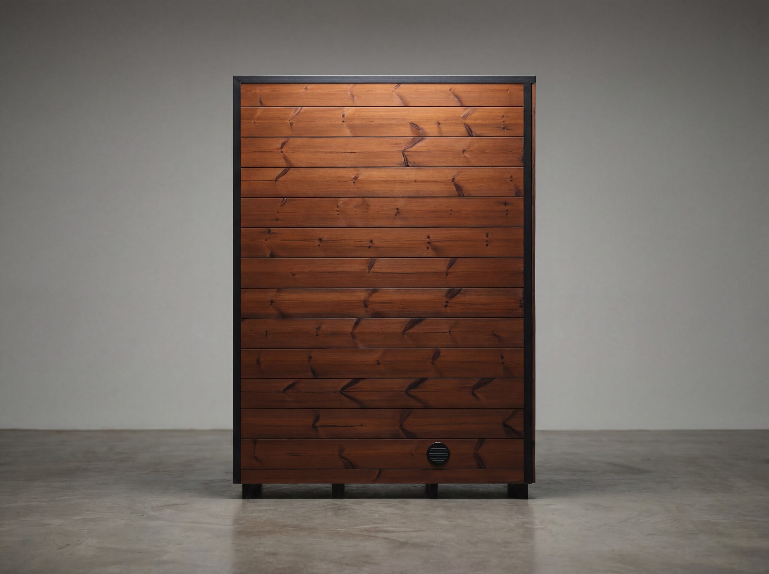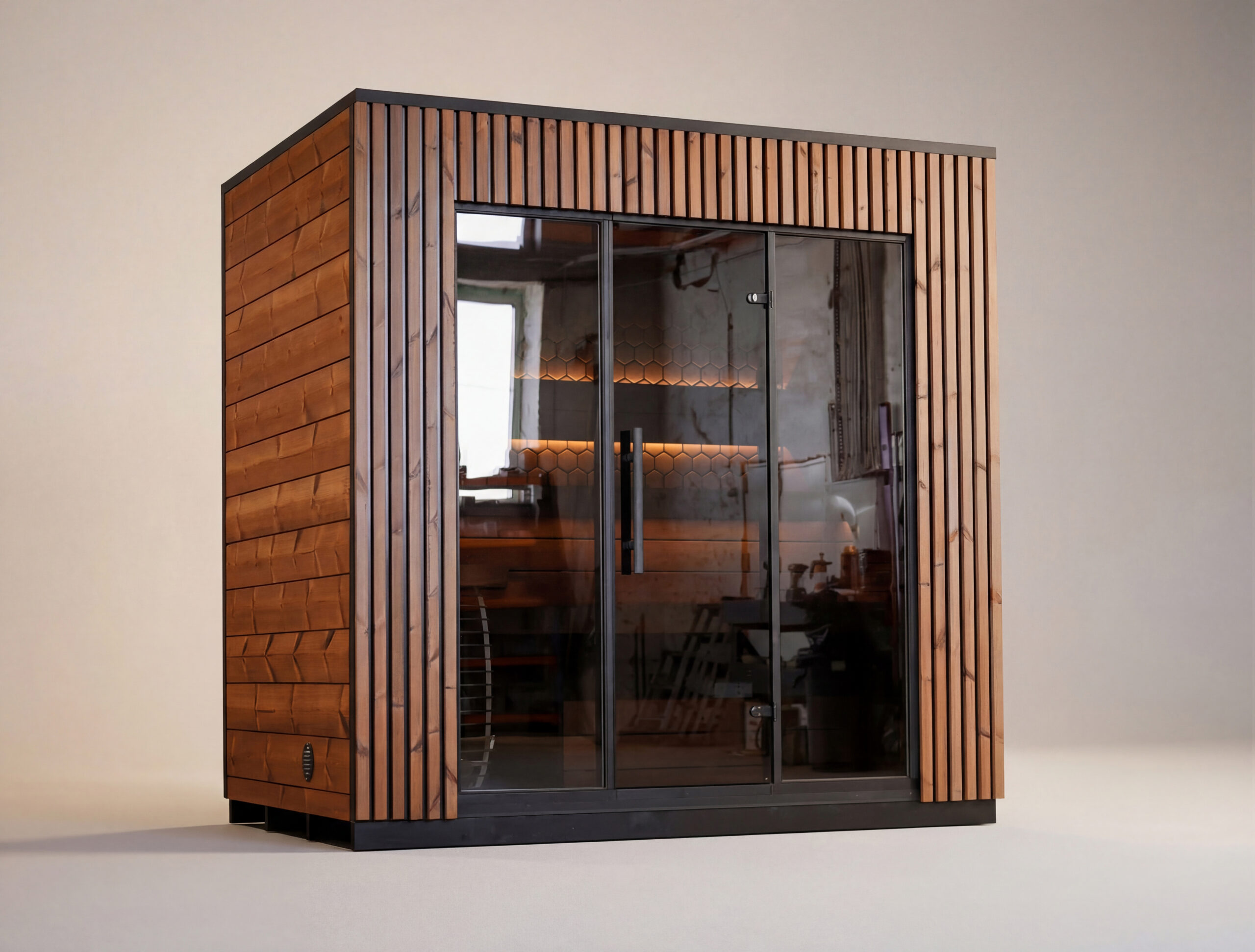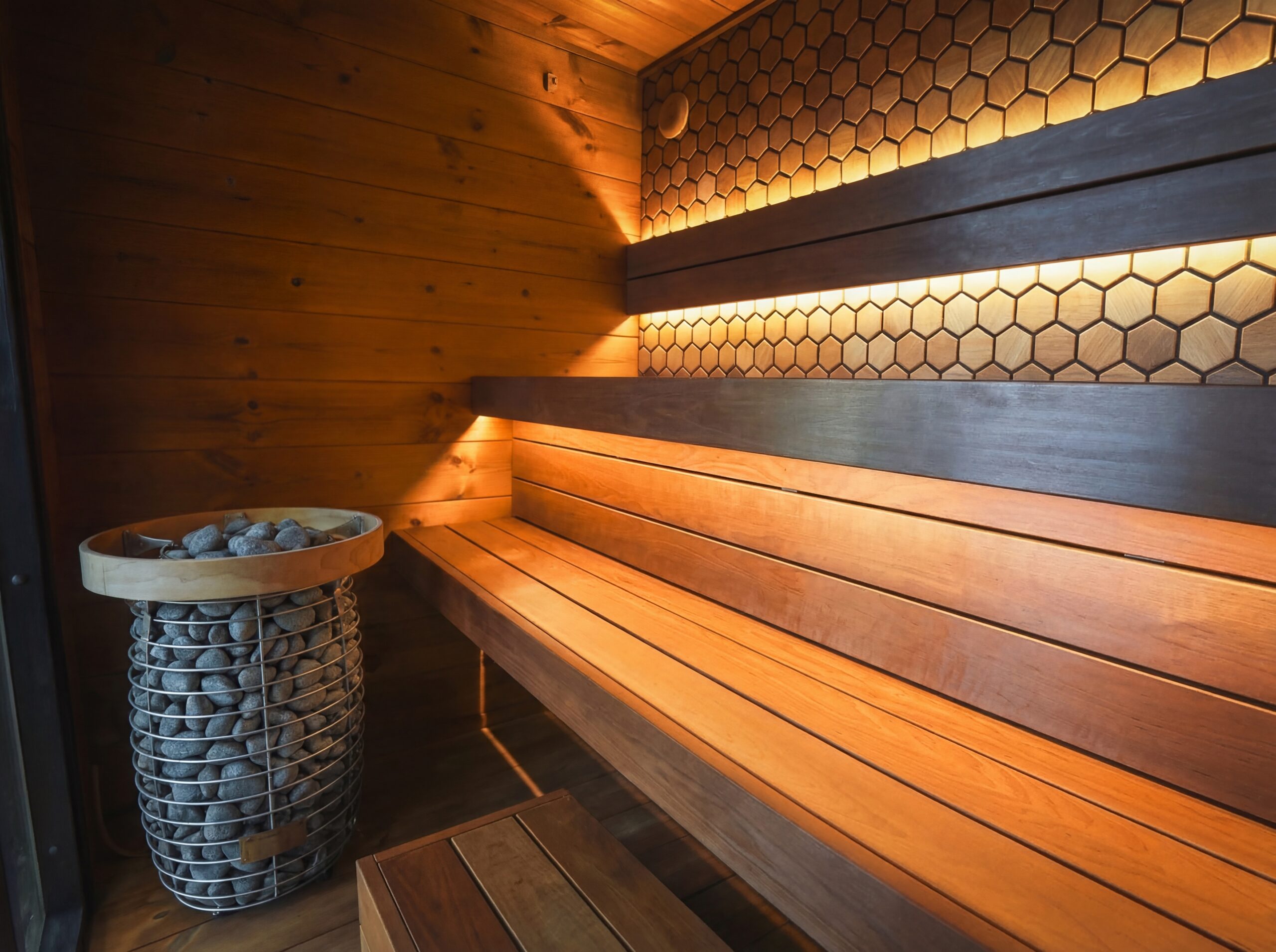 Sauna for four. Added height creates a lighter, airier feel. Seating is aligned with the heater level for natural posture and a more even leil.